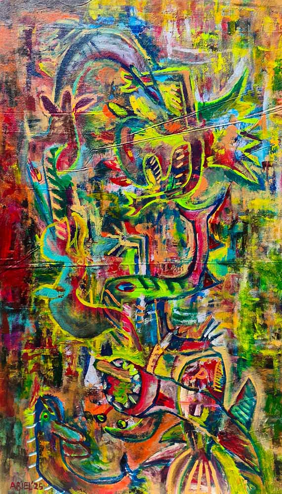 Melalui karyanya, Ariel Ramadhan seolah mengajak kita merenung, bahwa di balik semua “kekacauan” dengan visual garis, warna dan bentuk yang saling bertumpuk-bersilangan, bahkan seperti pesta kembang api di kedalaman laut, ada sebuah keseimbangan yang halus. Setiap makhluk, setiap sapuan warna, dan setiap garis yang tumpang tindih memiliki tempatnya masing-masing.