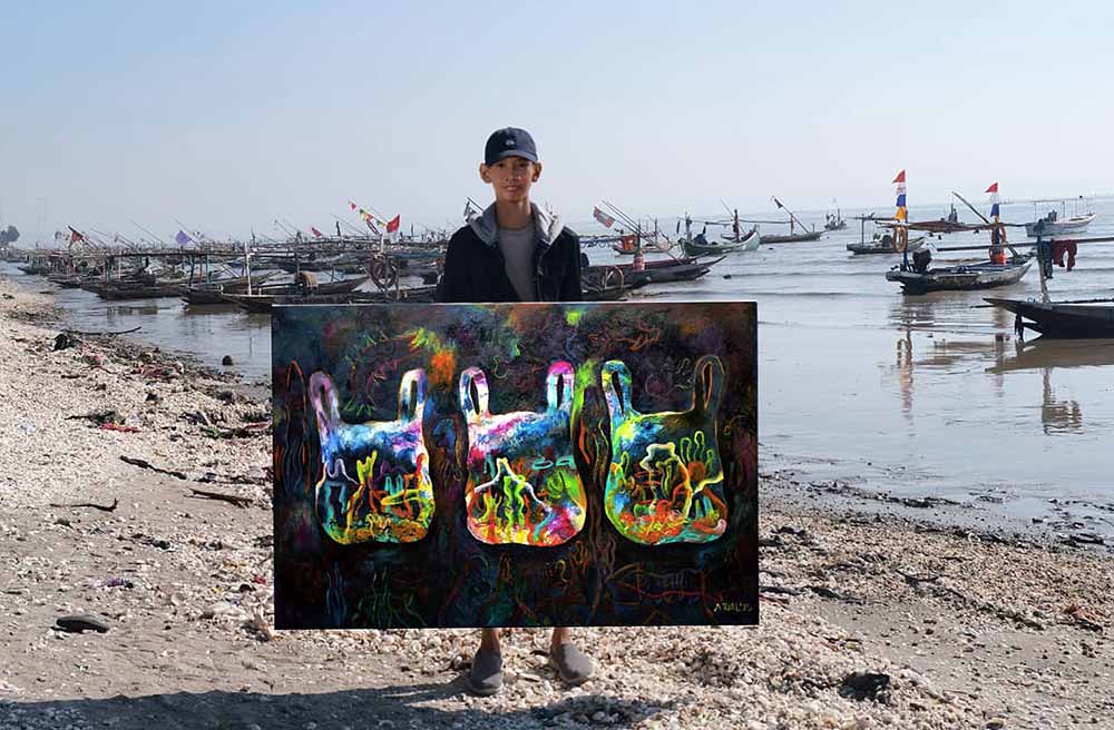 Ariel Ramadhan dan karya lukis terbarunya berjudul “Laut Dalam Tiga Kantong Plastik”, cat akrilik di atas kanvas 100×150 cm, 2025