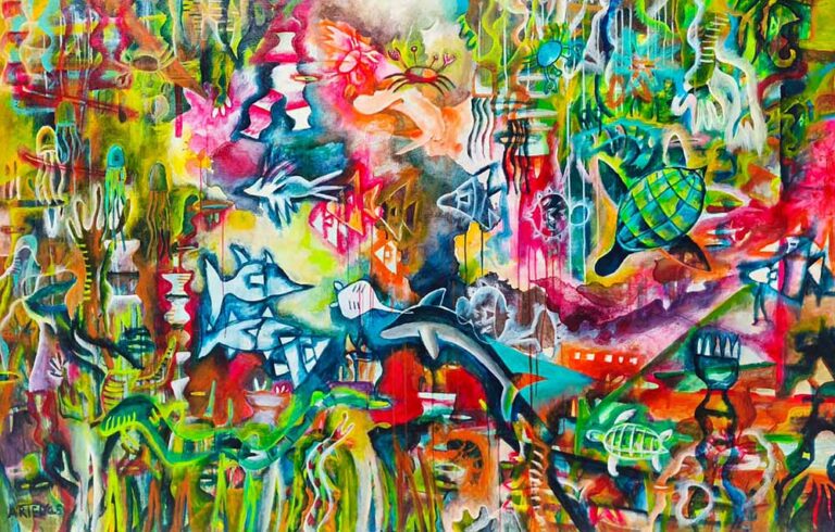 Warna adalah bahasa utama dalam “Segara Warna” Biru tua dan biru kehijauan yang intens berpadu dengan ledakan warna-warni seperti kuning cerah, merah marun, oranye membara, dan pink yang mengejutkan. Percikan-percikan warna ini tidak sekadar hiasan, melainkan detak jantung dari ekosistem yang semarak di luasnya samudra. Mereka melambangkan siklus kehidupan, kematian, dan kelahiran kembali yang tak pernah berhenti.