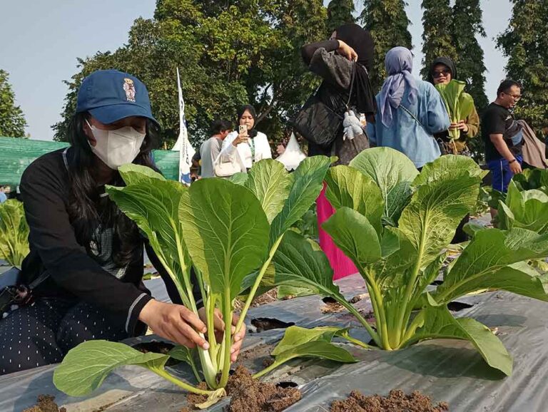 Seorang pengunjung di acara Petro Agrifood Expo di Kebun Percobaan (Buncob) Petrokimia Gresik sedang memetik sayur. (FOTO: PRESKON.ID)